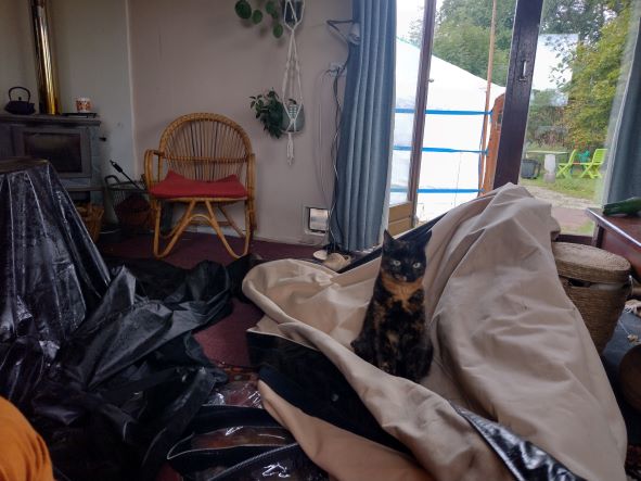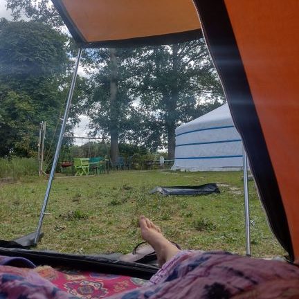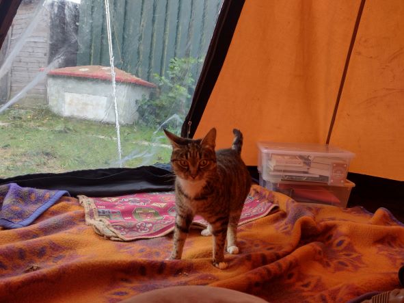 Toen het EINDELIJK weer ging regenen moest ik van mezelf opnieuw de tent uitproberen (hij stond na 2 weken nog steeds) en je raad het al: natte voeten! Het grondzeil is niet waterdicht, maar bovendien lijkt het grondzeil helemaal niet goed in de tent te zitten, er is veel te veel grondzeil over. En zo zijn er nog meer dingen die ik niet snap aan de tent, maar gelukkig willen de originele makers van de tent wel een keer een kop koffie met mij drinken om de how to’s door te spreken! Daar heb ik heel veel zin in, en ik hoop dan wat meer zelfvertrouwen over de tent te ontwikkelen. Ondertussen stinken de polyester dekens naar vocht en ligt de tent te drogen in mijn kleine stacaravanwoonkamertje. Die moet ik maar eens in gaan pakken als ik inspiratie heb verzameld over hoe dat moet.