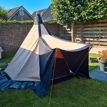 De tent had ik een dag na aankoop al opgezet in de tuin. Ik had er zoveel zin in! Het is een klein tipitentje van 3,20 meter doorsnee van het merk ProTipi. Een echtpaar heeft hun model van een tipitent geperfectioneerd en vervolgens besloten honderd tipi’s in verschillende maten op de markt te brengen. Zelf genaaid, de kachels zelf gesmeed, en veelvuldig uitgeprobeerd. De tipi heeft een middenpaal waar het doek rondom op leunt, en het leuke is dat je in de winter die paal vervangt door de kachelpijp en er een klein – brievenbusformaatje – kacheltje aan kunt hangen. Dat geldt althans voor mijn tipi, de grotere hebben natuurlijk flinke kachels.