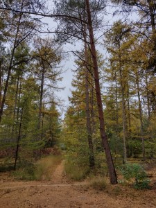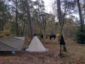 Dan nu terug naar de huidige stand van zaken. Het regende deze week wat, maar het was ook veel droog (optimist ben ik hè?!). Ik was bang dat mijn tent weg zou drijven omdat ik in een kuiltje sta, maar mijn spullen & ik bleven superdroog! Ik had een drukke week en was veel weg, en kwam dan in het donker thuis aan. Ik lag steeds al om 20/21:00 op bed en sliep ook vrij snel, en had de wekker om 6:00 staan zodat ik met het opkomende licht mijn koffietje aan het zetten was. Ik drink trouwens gewoon van die oploscappuccino’s, want dat is gewoon lekker en makkelijk. En ik kook op een benzinebrander wat fijn is want het gaat langer mee, is overal verkrijgbaar en kan ook tegen koude temperaturen. Ik ben ook een paar keer in de regen thuisgekomen, en dan hing ik mijn kleren gewoon op onder de tarp en dook ik mijn warme donzen slaapzak in en sliep ik heerlijk in met kletterende regen boven mijn hoofd. ’s Avonds, als ik nog niet slaap, app ik met vrienden, lees ik een boek, oefen ik op mijn blokfluit, of schrijf ik in mijn dagboek. Kortom: ik leef de droom.