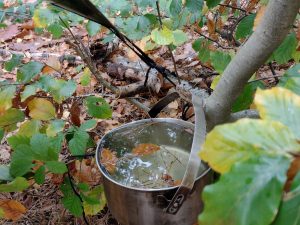 Met de regen leek het eerst een crime om vanuit iemands warme huisje weer terug te gaan naar het natte, donkere bos. Maar eenmaal daar aangekomen voelde ik me juist veel meer op mijn gemak. Als het in het bos regent is het nog steeds mooi. Als het in de stad regent is het een depressieve bende (vind ik). Dus ik liep gewoon ultiem happy (en brak) door een regenachtig, schemerig bos en voelde me zó thuis! Ik kan me echt niet meer voorstellen dat ik ooit niet meer in een bos woon, want dan word ik denk ik meteen vreselijk ongelukkig. Bos is alles voor mij. De regen is ook nog praktisch: want door een pannetje onder het laagste punt van mijn tarp neer te zetten heb ik drie dagen mijn eigen watervoorziening geregeld! Wel kreeg ik op Instagram de opmerking dat regen verontreiniging uit de lucht opneemt en je dit dus beter niet moet drinken. Ik kookte er een lekker groentesoepje van en zette er mijn bakkie mee, maar ik zal er maar niet al te veel van innemen. Misschien kan ik er de afwas of de was mee doen, of mezelf eens een keer wassen want dat mag ook wel wat vaker ;) (koud!!).