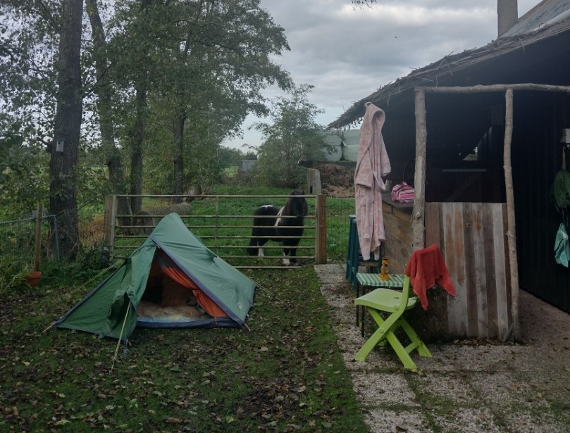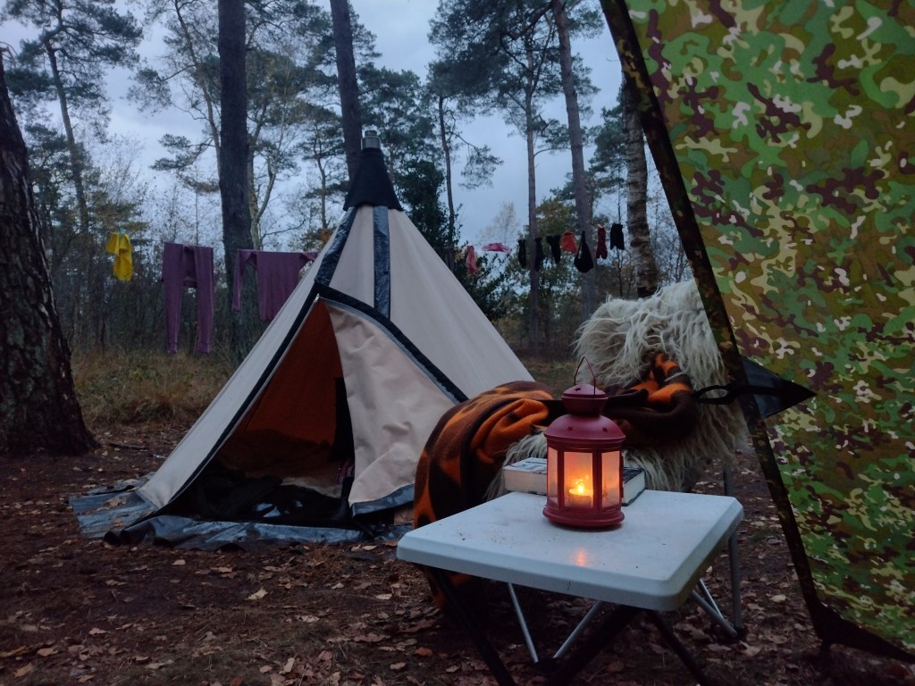 Ondertussen maakte ik me klaar om naar een leuk terreintje van de kampeerclub NTKC te vertrekken met mijn eenpersoons tipi. Die had ik op Marktplaats gevonden en met mijn moeder in Friesland opgehaald. Superklein en met een kacheltje. Want als ik dan een winter in de tent wilde overleven had ik naar mijn idee toch wel iets van een warmtebron nodig. NTKC heeft terreinen die heel mooi in de natuur liggen en het hele jaar open zijn. Daar begon ik voorlopig dan maar eens mee.