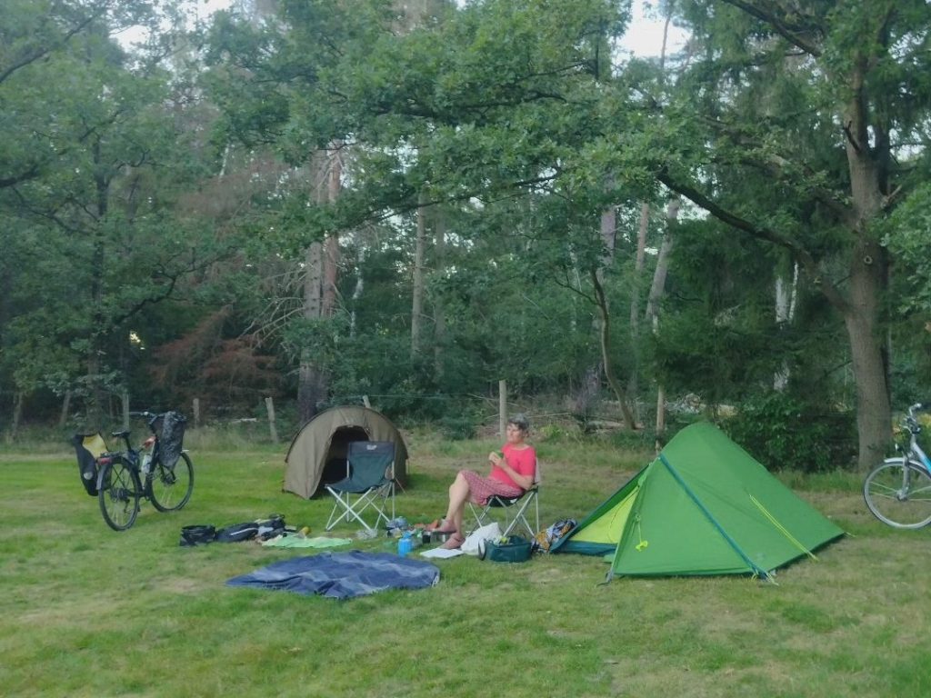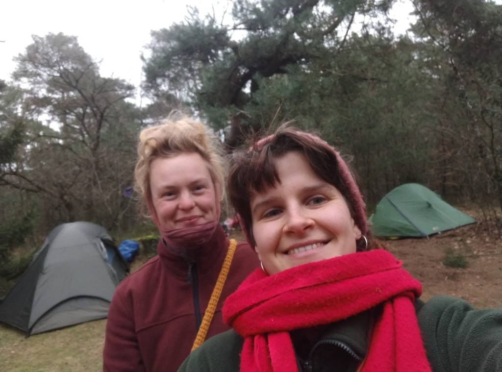 Tegen de tijd dat de drie weken voorbij waren, voelde ik me een beetje lamlendig. Ik was moe en hangerig geworden van het binnen zitten. Ik wilde weer naar buiten, maar ik wilde het ook anders. Ondanks afraden van iedereen besloot ik dit keer op de fiets te vertrekken en met mijn trekkerstentje. Tipi met kachel kon alleen met de auto, en ik wilde juist de vrijheid voelen van overal en nergens naartoe kunnen trekken! Zwervervriendin Zora had ook zin om haar nieuwe tentje uit te proberen en dus maakten we een kampje in het bos. Zo gezellig samen!