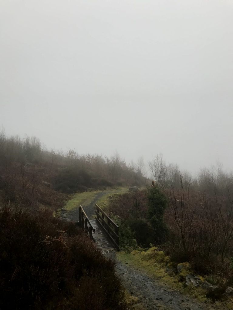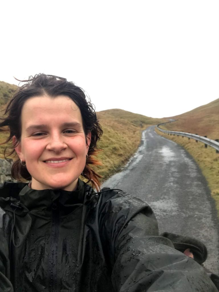 De volgende dag moest en wilde ik er toch weer aan geloven. Dit keer had ik tóch stiekem de weersvoorspelling gecheckt en die zei voornamelijk wolkjes (30% kans op regen noem ik droog). Dus ik lekker mijn wollen broek aan en fleecevest, regenpak had ik geen zin in. Met een natte tent achterop gebonden begon ik nu aan de échte hoogtemeters. Zelfs mijn routeboekje zei het: ‘3 kilometer steile klim’. En het ging toch weer miezeren, maar dat waren die 30% druppels, die zouden zo wel weer wegtrekken, vond ik. Inmiddels was van binnen alles ook nat van het zweet en bleef het maar regenen, maar met het vooruitzicht straks in een huis te zijn liet ik mijn regenpak in de tas. Helemaal doorweekt met een zware wollen broek die alle regen had geabsorbeerd en natte schoenen die nog natter waren dan gister bereikte ik de top. Wat een uitzicht! Om me heen rotsige heuvels en watervallen gehuld in mist, wauw. Ik zou volgens het boekje nu ook 3 kilometer naar beneden sjezen, maar dat was minder leuk dan het klonk. Het was zó koud met alles doorweekt en de heftige wind dat ik hele harde liederen ging schreeuwen om het aan te kunnen: