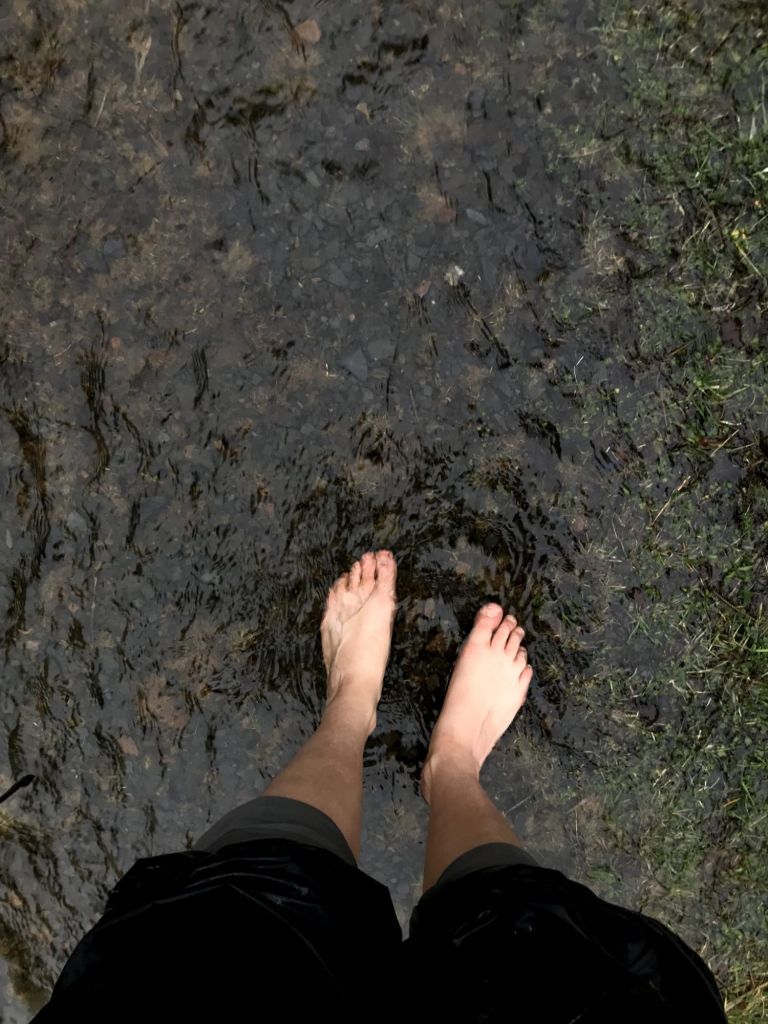 En regenen bleef het, dus las ik de hele ochtend en middag mijn boek terwijl ik theetjes dronk en chips at. En eigenlijk was het heerlijk om de hele dag warm in mijn slaapzak te liggen en te lezen, met het tikkende geluid van regen op mijn tentdoek. Om vier uur was het even droog en rekte en strekte ik me buiten onder het gezang van alle vogeltjes. Een wandeling zou me goed doen, bedacht ik me, en de uren daarna regende ik alsnog zeiknat, waadde ik op bevroren blote voeten door diepe plassen en ging het harder regenen dan het de hele dag nog gedaan had. Maar ik was tevreden. Ik zou terugkeren naar een droge tent en het landschap was prachtig. ’s Avonds stak ik een waxinelichtje aan en las ik verder in mijn boek en voelde me een onwijs gelukkig mens. Midden in het bos, aan een vredig meer, zonder ook maar een mens om me heen. De hele dag buiten, maar toch ook binnen. Fantastisch.