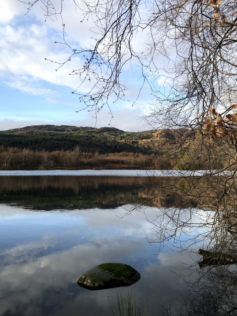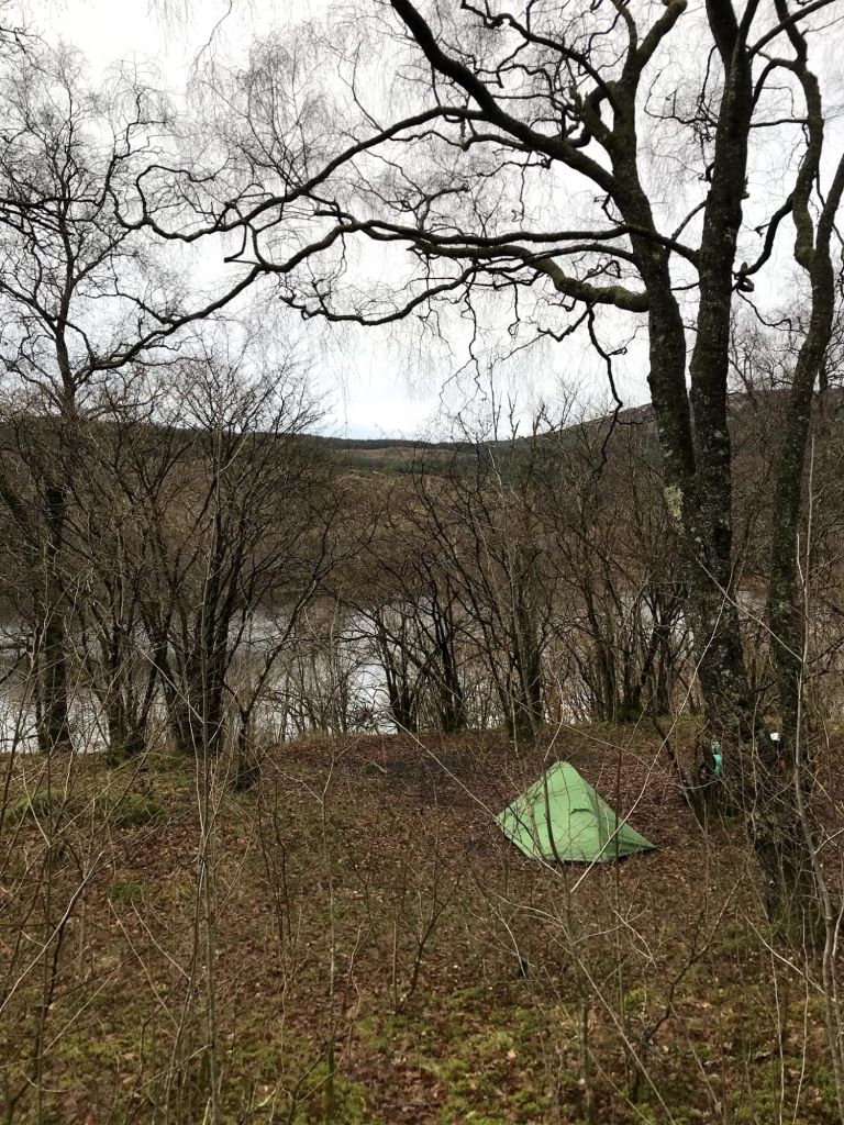 ‘Geen topdrukte’ bleek een understatement want er stonden maar twee auto’s op de parkeerplaats. Sowieso was ik dolgelukkig want het was zo fijn eindelijk weer in het bos te zijn na al die open heuvels! Een bos zonder dorpjes en mensen en fabrieken. Met mijn fiets aan de hand liep ik over het wandelpad, wat steeds onbegaanbaarder werd. De rivier kolkte en stroomde keihard, de paadjes bijna overstromend. Ik zette mijn fiets neer om maar te voet verder te verkennen en kwam na me door bosjes heen te ploeteren een prachtig vlak stukje grond tegen, vlak boven het meer. Aan het meer was ook een vlak stukje, maar dat lag aan het pad en vond ik spannend met eventuele waterstijgingen. Nee, dit plekje was perfect. Hoewel het echt een beetje tegen mijn gevoel indruiste, zette ik gewoon om vier uur ’s middags mijn tentje al op. Wildkamperen mag gewoon in Schotland, ik ben niets illegaals aan het doen! Raar gevoel, maar oh zo fijn.