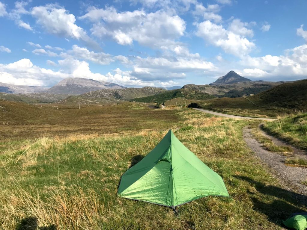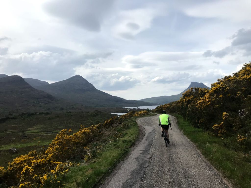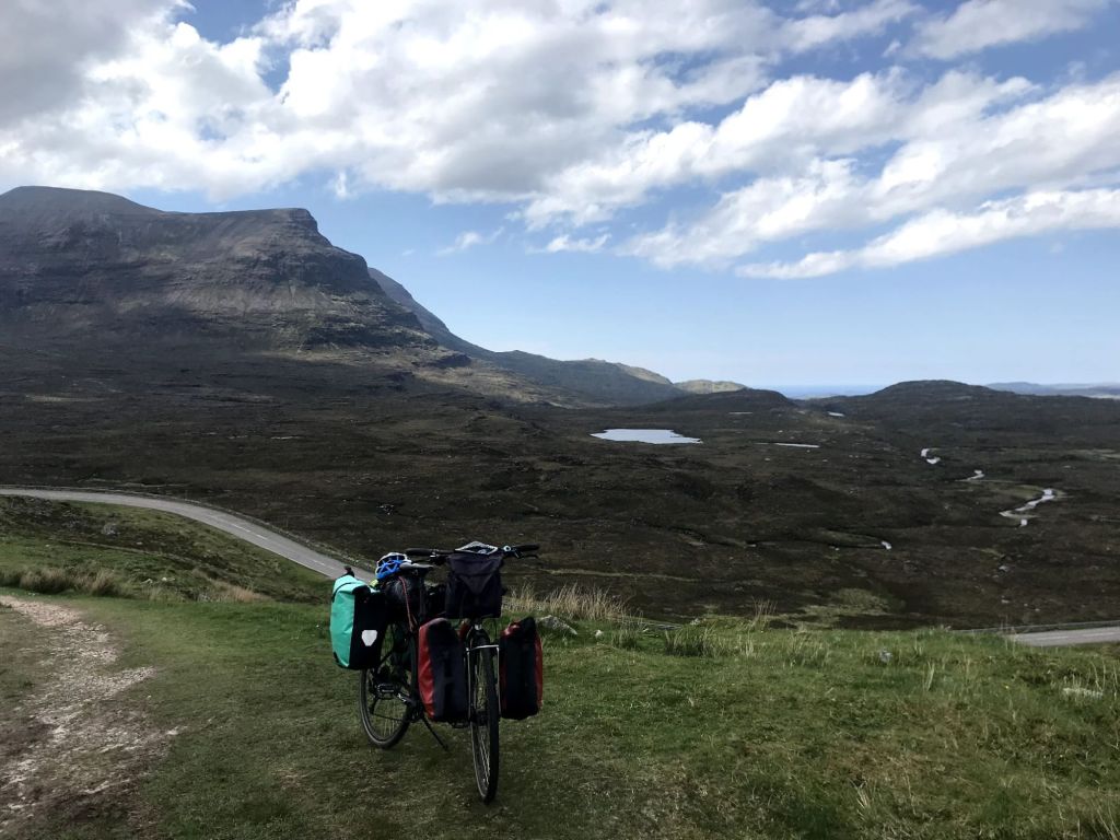 Ik kwam in een fietserspeleton terecht toen ik vanuit Ullapool tegen vieren eindelijk op de fiets stapte – ik had weer eens een leuk koffietentje ontdekt. Een club van twaalf Celtic aanhangers (voetbalclub in Glasgow) die een weekje fietsten terwijl hun bagage vervoerd werd. Er zat ook een Nederlander bij en happend naar adem van het omhoog fietsen probeerden we een gesprek te voeren. Een Schotse man van de groep ging altijd een uur eerder weg omdat hij wat rustiger fietst, inmiddels hadden ze hem ingehaald. Ik bleef met hem fietsen ver achter de groep en zonder het te benoemen fietsten we de 40 kilometer daarna samen. Wijzend naar mooie bergen, vliegende koekoeken en chips etend in de berm. Toen was ik toe aan pauze en aan een tentplek, hij ging door naar zijn hotel. De dag erna ging me minder makkelijk af. Ik realiseerde me dat bergop fietsen een stuk makkelijker is met gezelschap, omdat je minder snel opgeeft en mentale afleiding hebt. Aan de andere kant kan ik beter genieten van het landschap als ik alleen ben. En dat is me toch ff net wat meer waard (hoewel: afwisseling is key natuurlijk).