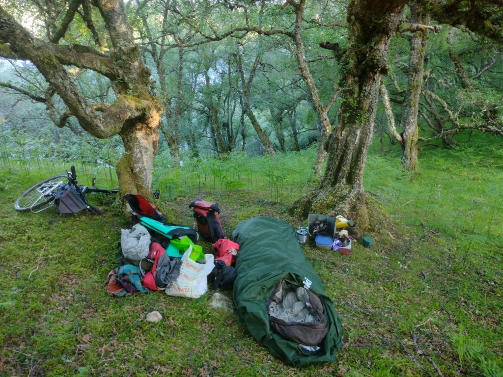 Mijn tassen waren veel te volbeladen. Ik had ook dingen op de camping achter kunnen laten, maar wilde gewoon alles mee voor het geval ik er een paar dagen van zou maken. Ik was dus best snel moe maar zag zo snel niks geschikts in het gebied. Ik sjouwde mijn fiets nog een weggetje op maar dat bleek een graasweide voor koeien. Hoewel ik ze niet zag, was de grond helemaal kapot getrapt dus dat zou ook niet lekker liggen. Na maar gewoon een uur onder een boom te hebben gelegen, hopende dat de oplossing zich vanzelf zou aandienen (gebeurt meestal wel), gaf ik mezelf twee opties. Dat ene plekje aan het water uitchecken: hoewel die vol in de wind stond liep er misschien nog een paadje om de heuvel heen. Of hier langs de weg in de bosjes een plat stukje vinden. Optie twee won, want de wind was echt niet te doen.