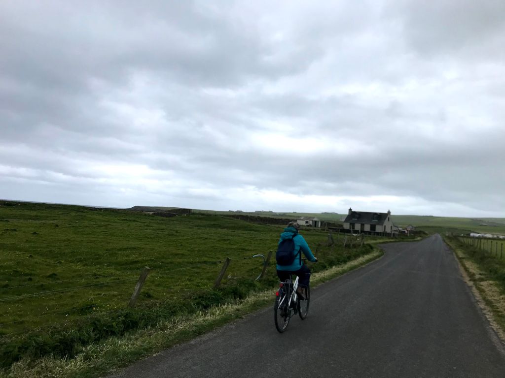 Nog typischer is dat we fietsen huurden want dAt iS tOcH LeUk en vervolgens dertig kilometer lang in de volle tegenwind heuvel op naar het Noordelijkste puntje van Orkney (het grootste eiland van de groep) fietsten. Toen we daar waren hadden we een hekel aan onszelf want er was niets te beleven en we waren helemaal kapot. Onderweg was er ook niet veel te zien: schapen, grijsheid, en kaalgevreten grasvelden. En toen moesten we nog terug. “Wat doen jullie in vredesnaam op die uithoek van de wereld?” hoor ik je denken.