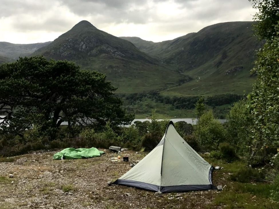 John en Jess zaten daar ook en de rest van de dag haalden wij en de andere wandelaars elkaar steeds omstebeurt weer in. Het voelde een beetje als samen de trail doen, wat erg gezellig was. ’s Avonds was Wen opeens kwijt en hadden we allemaal problemen met een kampeerplek vinden, dus mijn voornemen van de vorige dag moest ik alweer schenden. Om zeven uur had ik een plek met awesome uitzicht, stromend water en… shit, midges en een stenige grond. De haringen gingen er met geen mogelijkheid in. Terwijl ik proestte en mezelf sloeg om midges weg te jagen trachtte ik de elastieken van mijn tent om stenen te binden en hoopte ik dat het niet hard ging waaien. Shit, prioriteit 3 vergeten, zachte grond! En wat boeide dat uitzicht nou weer als ik tóch in de tent opgesloten zat? Ik was boos op mezelf, dat ben je dan makkelijker als je moe bent. De hele nacht regende het, maar mijn steenconstructie bleek gelukkig sterk genoeg. Ik at wat minder en sliep beter, dus dat was een win.