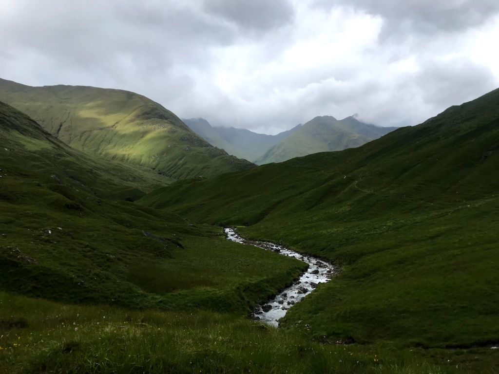 Wen bleek die dag ergens helemaal verkeerd te zijn gelopen, maar de volgende ochtend liep hij met met Jess en John voorbij terwijl ik mijn tent aan het inpakken was. Ontbijten was weer een onmogelijkheid door de midges, later op de dag zouden ze minder worden. De wandelaars wachtten op mij en zo liepen we af en toe samen, maar meestal apart van elkaar, op weg naar de gezamenlijke bestemming: de bothy. Vrijwilligers onderhouden een heleboel van deze hutten in de wildernis van Schotland en je mag daar je matje uitrollen en als je wilt een vuurtje stoken. Echt een fantastisch concept en een fijn vooruitzicht met mijn inmiddels groter geworden blaren! De route was nu echt waanzinnig geworden. De dramatische wolken maakten de hoge bergtoppen extra imponerend en ik voelde me ultiem hobbit. Wel was mijn hoofd weer een beetje chagerijnig en was ik erg moe, gelukkig zou het maar een korte wandeling zijn. In de bothy, waar we om drie uur al aankwamen, vermaakten we ons met saaie verhalen en spinnen bekijken en las ik in Twilight.