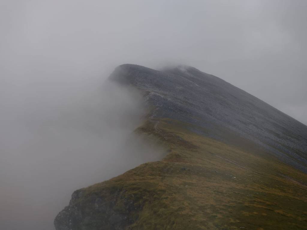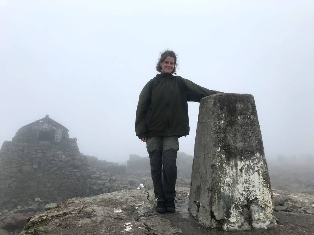 De regen werd steeds erger en ik was tot op het bot doorweekt. Pauze houden was geen optie want de keiharde wind zou misschien wel tot onderkoeling kunnen leiden. De wind werd zo erg dat ik een paar keer naar de grond dook en plat ging liggen om niet van de bergkam af te waaien. Het was best eng maar ook wel weer vet en ik zorgde ervoor dat ik een flink stuk van de klifzijde af liep (speciaal voor mijn moeder van wie ik nooit dichtbij de rand mag komen). Gelukkig hield mijn wollen thermokleding hoewel nat me goed warm, echt lang leve wol, dus ik riep even bedankt naar de schaapjes. Toen ik op de tweede munro stond kon ik weer ver om me heen kijken en het was echt machtig. Ik was ook niet te doen #dankbaar dat ik hier niet met backpack en tent stond. Ik wilde zo snel mogelijk naar beneden, douchen en warme chocolademelk drinken en voor altijd slapen.