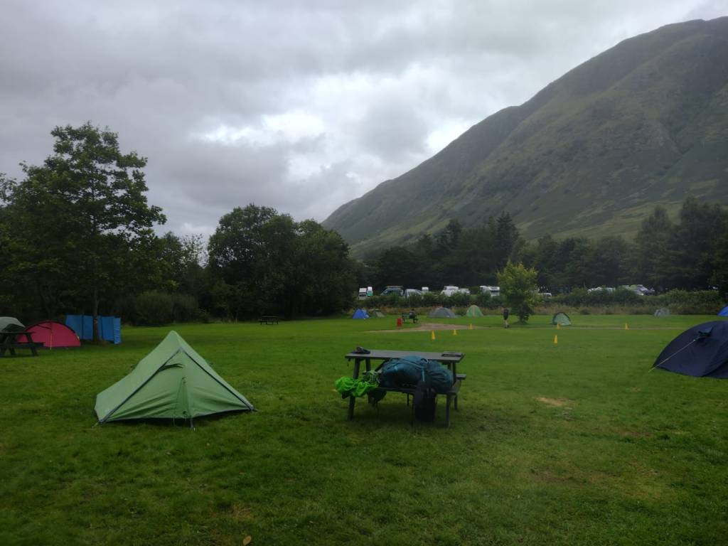 Door de harde wind en regen waren er geen midges, dat was echt een grote win. Tussen de buien door kon ik gewoon lekker m’n broodje kaas en kopje earl grey thee aan de picknicktafel eten, met uitzicht op de Ben Nevis, de hoogste piek (1345m) van het Verenigd Koninkrijk! Het was ook zondag dus iedereen pakte zijn tent in, vanavond zou ik het veld voor mezelf hebben en dat was een goed vooruitzicht. Eén van mijn wensen voor deze reis was ook die Ben Nevis beklimmen en als ik vorig jaar niet door Zora de berg Snowdon in Wales opgesleept was had ik nooit gedacht dat ik het zou kunnen. Ik dacht dat bergklimmen voor zieke pro’s was, maar vooral die bekende bergen hebben hele goed onderhouden paden. Ze zijn daardoor soms veel makkelijker dan sommige lagere maar veel minder bewandelde bergen (zou ik de volgende dag ondervinden).