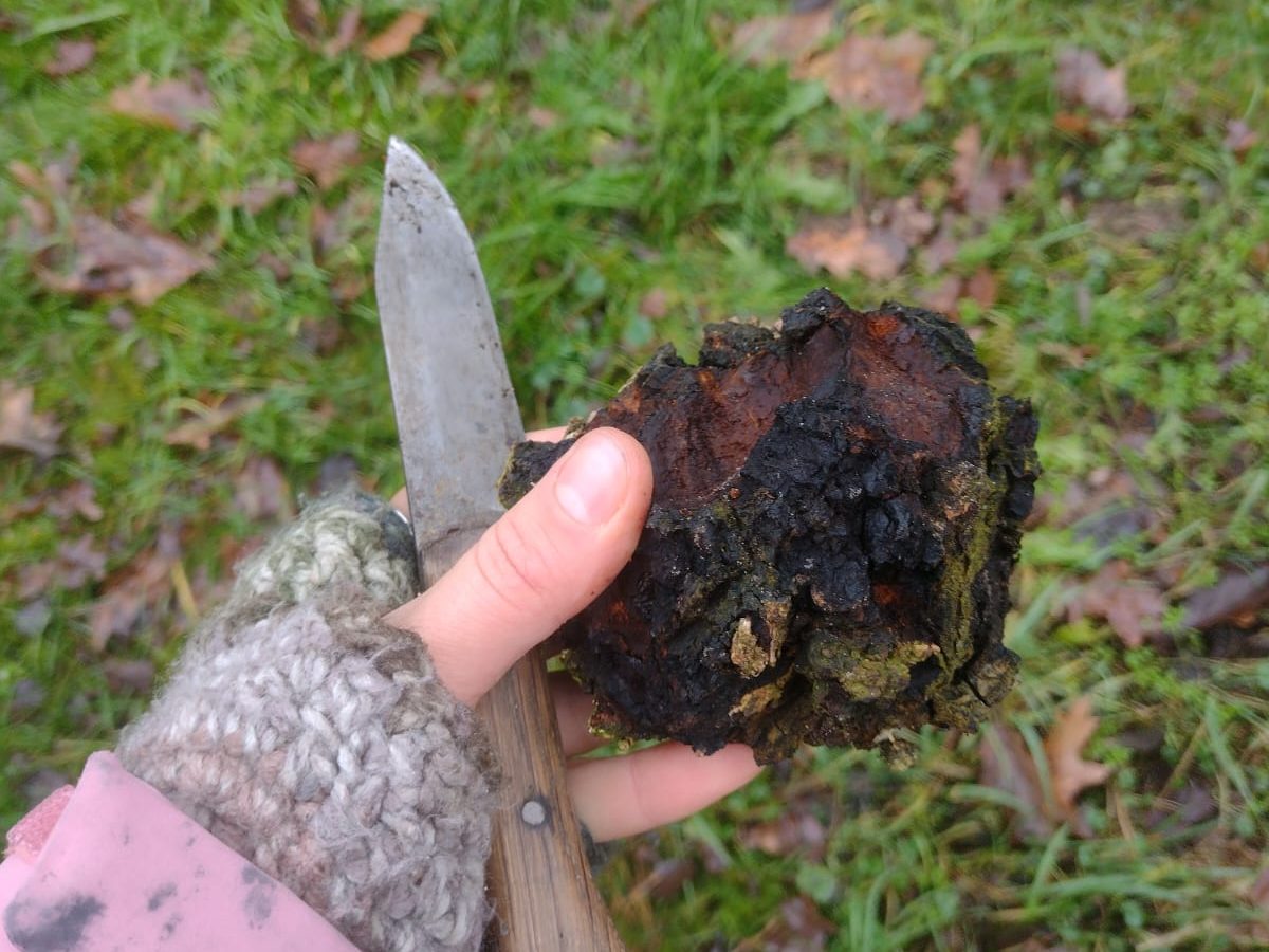 Hier op het terrein staat een berk die vol hangt met chaga, een medicinale paddenstoel waar je een sterke thee van kunt zetten. Ik heb wat geoogst en dat ligt nu te drogen op de kachel, de rest laat ik denk ik lekker aan de boom hangen. En zo vermaak ik me hier wel. Lezend, hakend, werkend, schrijvend, etend, hardlopend wandelend, tv-kijkend en slapend. Morgen weer verder na vier nachtjes tussen de magie van de heide en hunebedden.