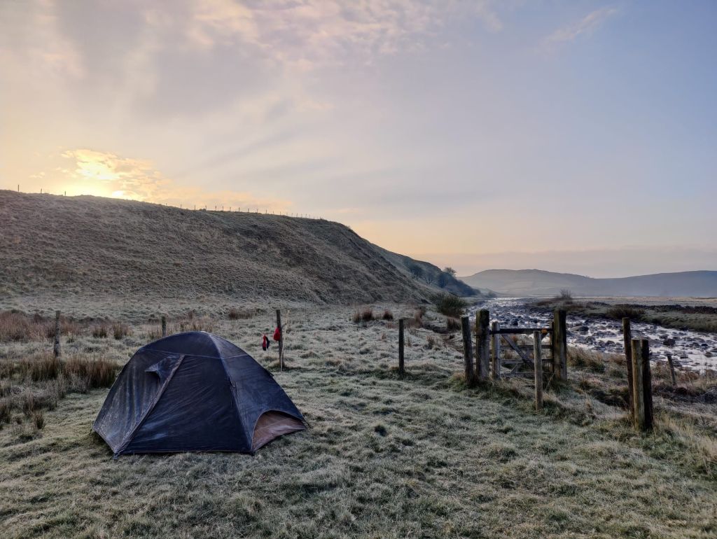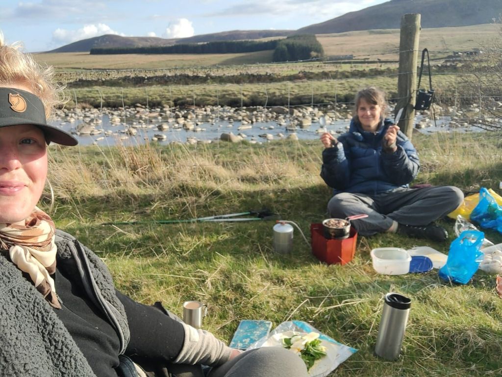 We moesten wildkamperen of 35 kilometer lopen, maar dat laatste is geen optie voor ons. Dus pleurden we onze tassen op een plat stukje nadat we een waterspreeuw zagen duiken in de rivier, bijzonder beestje! We hadden een stukje niet-weiland gevonden en dat leek ons wel netjes, maar daar kwam toch de schapenboer aan toen ik de heuvel zonder tas opgeklommen was op zoek naar 4G. “Mag ik vragen wat je hier doet?”.