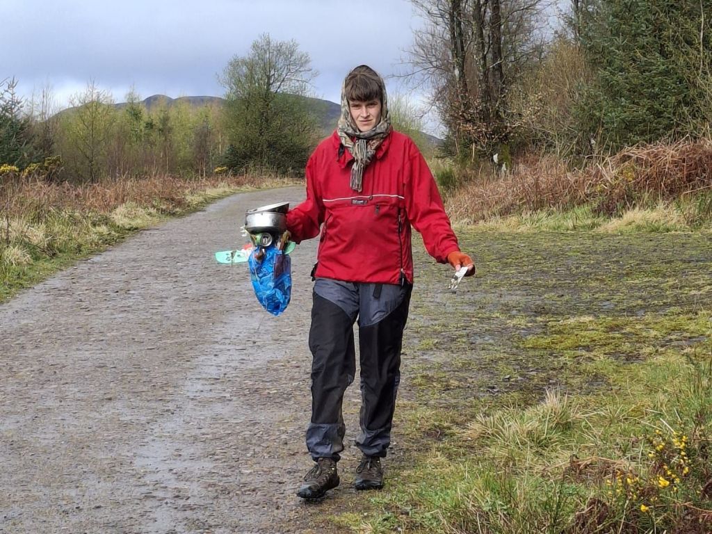 We hadden natuurlijk besloten toch niet af te kicken van koffie, en daar had de inn rekening mee gehouden door een voorraadje oploskoffie klaar te leggen. Dus we begonnen de dag met een bakkie nostalgie, omdat de geur van oploskoffie ons deed denken aan fietsvakanties. Net toen we weg wilden begon het helaas te hozen, en gingen we dus in vol regenornaat op pad. Mijn moeder wist waar we heen moesten, maar het onvermijdelijke gebeurde: twee (andere) mannen op straat gingen zich ermee bemoeien. We moesten die andere straat in en dan daar links en zus rechts en dan kwamen we op de West Highland Way uit. Wij dachten, het zal wel, ze zullen het wel weten. Maar na een paar honderd meter ging mijn moeders intuïtie aan haar knagen en keken we tóch even op de kaart. En jahoor, dat pad zou ons uitéindelijk wel naar de route brengen, maar dan zouden we een heel stuk overslaan. Dat wilden we helemaal niet! Dus keerden we ons weer om en liepen vol zelfvertrouwen het eerste weggetje weer in, hopend dat die mannen zouden zien dat we lekker zelluf doen waar we zelluf zin in hebben.